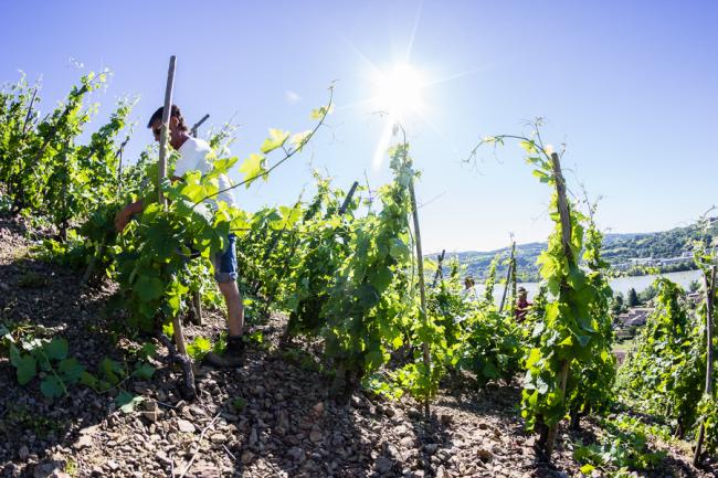 I have taken advantage of the first warm and sunny beautiful days of the spring to grow, in all directions: towards the sun as well as towards the soil, towards my hillside neighbours. Winegrowers take care of me; they remove my laterals, those tiny branches that won’t be useful to me anymore. Then they help me stand up and their delicate and skilled hands will then fix me along the stake with some rattan. I will keep growing, soaring up to the sun of the Côte-Rotie.